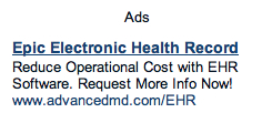 Looks like Advanced MD is trying some new SEO tactics by inserting the name of a top-selling EHR into the ads for their not-so-top-selling EHR. I’m not sure what they were going for here, but wouldn’t this make more informed potential buyers less likely to take a look at their product because of stupid advertising? Thanks for the chuckle, Advanced MD. Your poor attempts at craftiness are amusing.