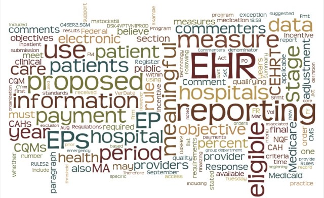 If you remember, back in the day I created a word cloud of the proposed Meaningful Use Stage 1 rule. The obvious implications of that visualization were that the government really wanted to dangle lots of money in front of healthcare organizations in order to use EHRs. Yet, despite initially touting the benefits to the patient of an EHR, the word cloud showed that the patient came way behind the money. Cynicism followed in the community.