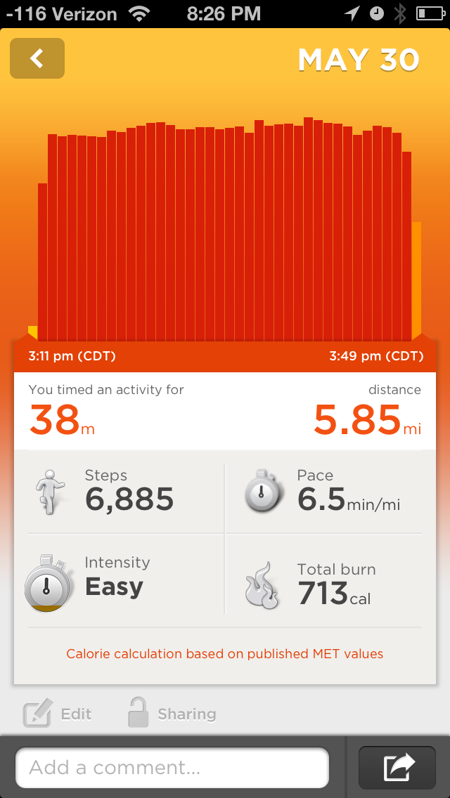 The food part I will keep brief because I’m still lamenting the loss of a feature after the first major update. Previously, an hour or two after you’d enter what you had for a meal into the app it would ask you how you were feeling (Energized, alert, sluggish, etc.). This simple question helped to connect how what one eats is related to how they feel later. McDonald’s for lunch = a slow afternoon. I have no idea why they took it out, but I found that my eating habits weren’t needing any change so I dropped using the feature all together.