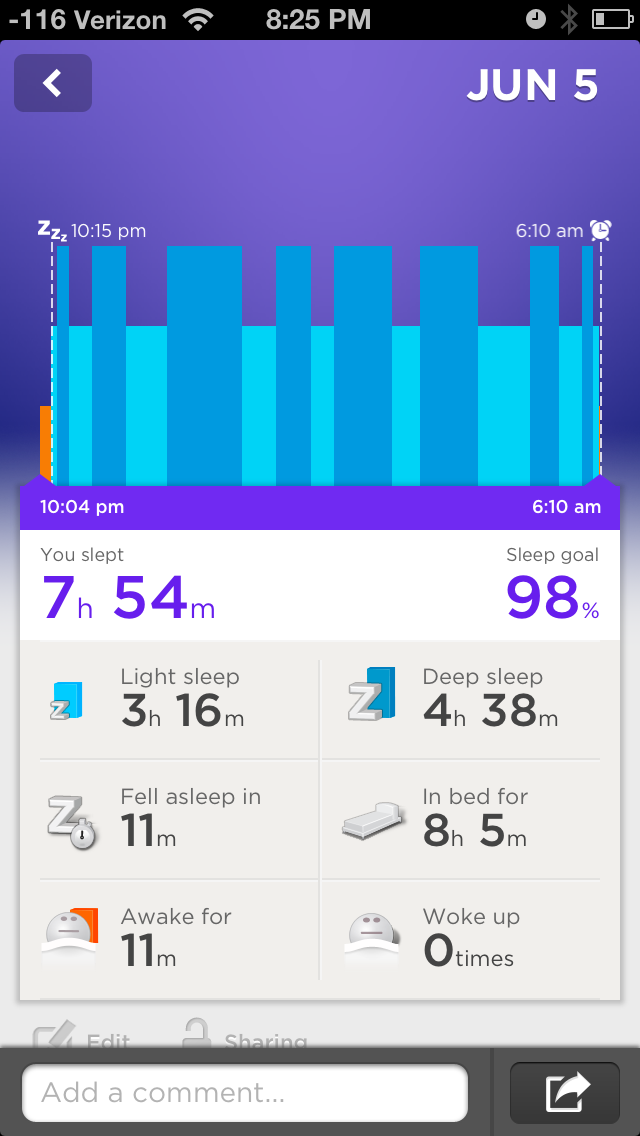 In terms of sleep, the vibrating alarm feature is set for the half-hour period in which you want to wake up. Then when you are in your light sleep cycle (think of this as your dreamy time) it will gently vibrate you awake. The claim is that you will feel more rested and less jolted when you wake up. Some of this may be coming from the placebo effect, but I thought the vibrating alarm was awesome. No loud alarms ripping you out of your slumber, just a gentle waking. This new habit of always being woken up in my light sleep pattern left me less groggy. When telling people about the UP, including a class full of informatics graduate students and instructors, this was the feature that everybody got pretty excited about. Does it help you get to sleep sooner? Partially. When thinking about changing habits, this was using a reward system. If you slept for the proper amount of time your chances of being woken up during your light sleep cycle before the half hour period you set your alarm for is much greater than if your body is trying to eek out some more deep sleep because you went to bed late, again, and the alarm has to wake you out of that at the last minute instead.